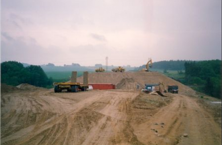 I 1989 - 1990 udførte YDING A/S sin hidtil største støbeopgave, en baneunderføring ved motorvejsbyggeriet mellem Onsild og Handest. En underføring er betegnelsen for en bro, der fører jernbanen under motorvejen. Denne ligger i engdraget ved Ølst, og bundforholdene var ret dårlige, der blev pilloteret ned i ca. 26 m, og med betonkonstruktionen dækket med sandpude, er den samlede byggehøjde over 30m. Her ses den afsluttende tildækning af underføringen med sand, derefter kunne entreprenørfirmaet SSS Simon S. Simonsen fortsætte sin entreprise med motorvejen.