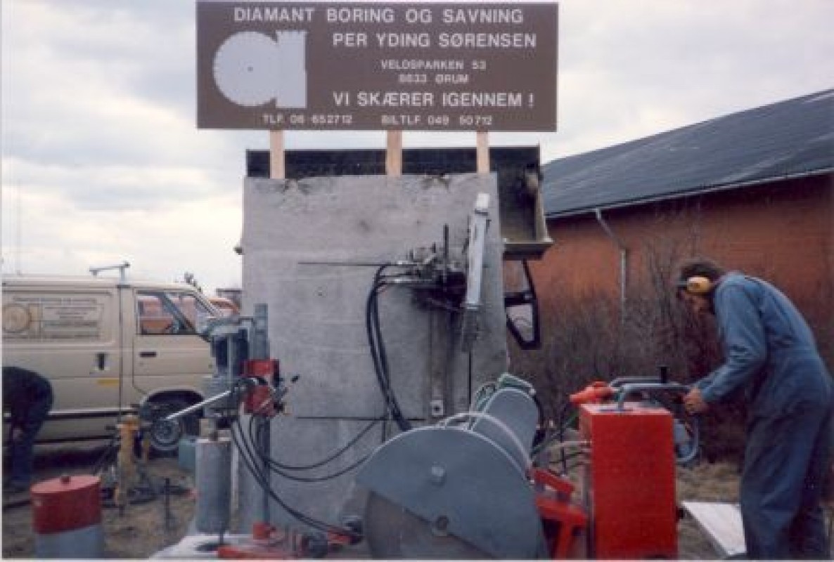 Der var engang, men sandt er det, at der i Tjele Kommune blev afholdt erhvervsmesse, og at Yding A/S deltog gennem flere år. I 1986 vandt vi årets initiativtagerpris, for at have etableret en afdeling i virksomheden med Diamantskæring. Diamantskæring eller beton- boring og skæring er en teknik, hvorved man kan skære og bore i jernarmeret beton. På det tidspunkt var YDING eneste firma, i det meste af Midtjylland, som udøvede denne niche professionelt, og fik på den måde kontakter i det meste af landet. YDING A/S markerede sig flere gange ved at besidde det største værktøj, bl.a. et 1200 mm bor, den største væg sav som Østrigske TYROLIT havde leveret til Danmark og den største væg sav som Svenske DINAS havde leveret til Danmark, da YDING A/S erhvervede en af de første Wiresave blev skæredybden UBEGRÆNSET som vi reklamerede med, det er i øvrigt samme teknik der anvendes, når man skærer store klippeblokke ud i stenbrud. YDING A/S anvendte Wiresaven til at overskære et hotel i Silkeborg, hvor lydtransmission fra en Bowlingbane, generede roen i den anden ende af hotellet. Bygningen blev ganske enkelt skåret midt over fra kælder til kvist, så der kunne lægges en blød fuge med Sundolit bagstop, derved stoppede lyd overførelsen og husfreden var genoprettet. Se i øvrigt mere her på hjemmesiden, under NEDBRYDNING.